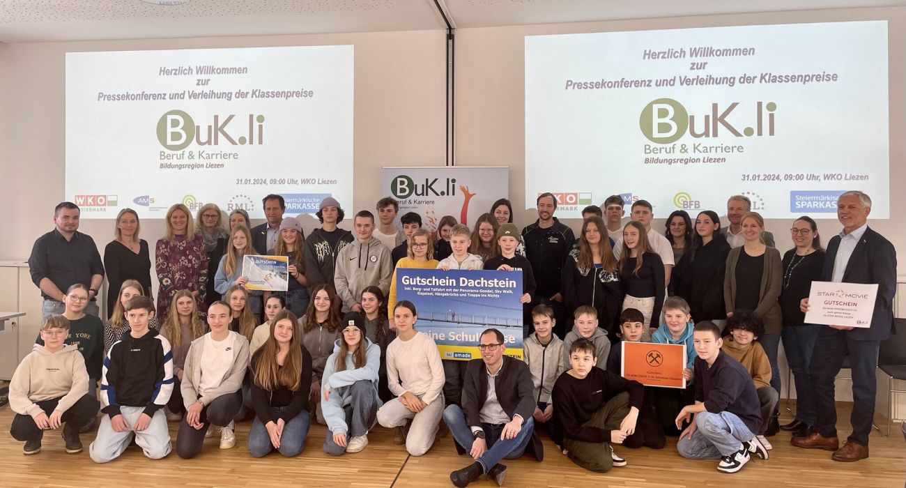 Die Preise wurden heute von den Veranstalter:innen und Sponsoren der BuK.li in der WKO in Liezen überreicht: der Geschäftsführerin des Regionalmanagements Bezirk Liezen Dr.in Eva Stiermayr, dem Leiter des AMS Liezen, Helge Röder, dem Obmann der WKO Ennstal/Salzkammergut, Egon Hierzegger, der Berufsfindungsbegleiterin Kathrin-Maria Engl von der Steirischen Volkswirtschaftlichen Gesellschaft und Heinz Walcher, dem Regionalleiter der Steiermärkischen Sparkasse. Seitens der Sponsoren waren Daniel Gerhardter von den Planai-Hochwurzen-Bahnen und Erwin Petz von der Riesneralm anwesend.